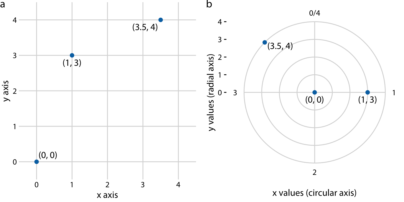Por eso, las coordenadas polares pueden ser útiles para datos de naturaleza periódica, de modo que los valores en un extremo de la escala se puedan unir lógicamente a los valores en el otro extremo (ejemplo: cuando se quiere ver cómo varía una cantidad a lo largo del año).