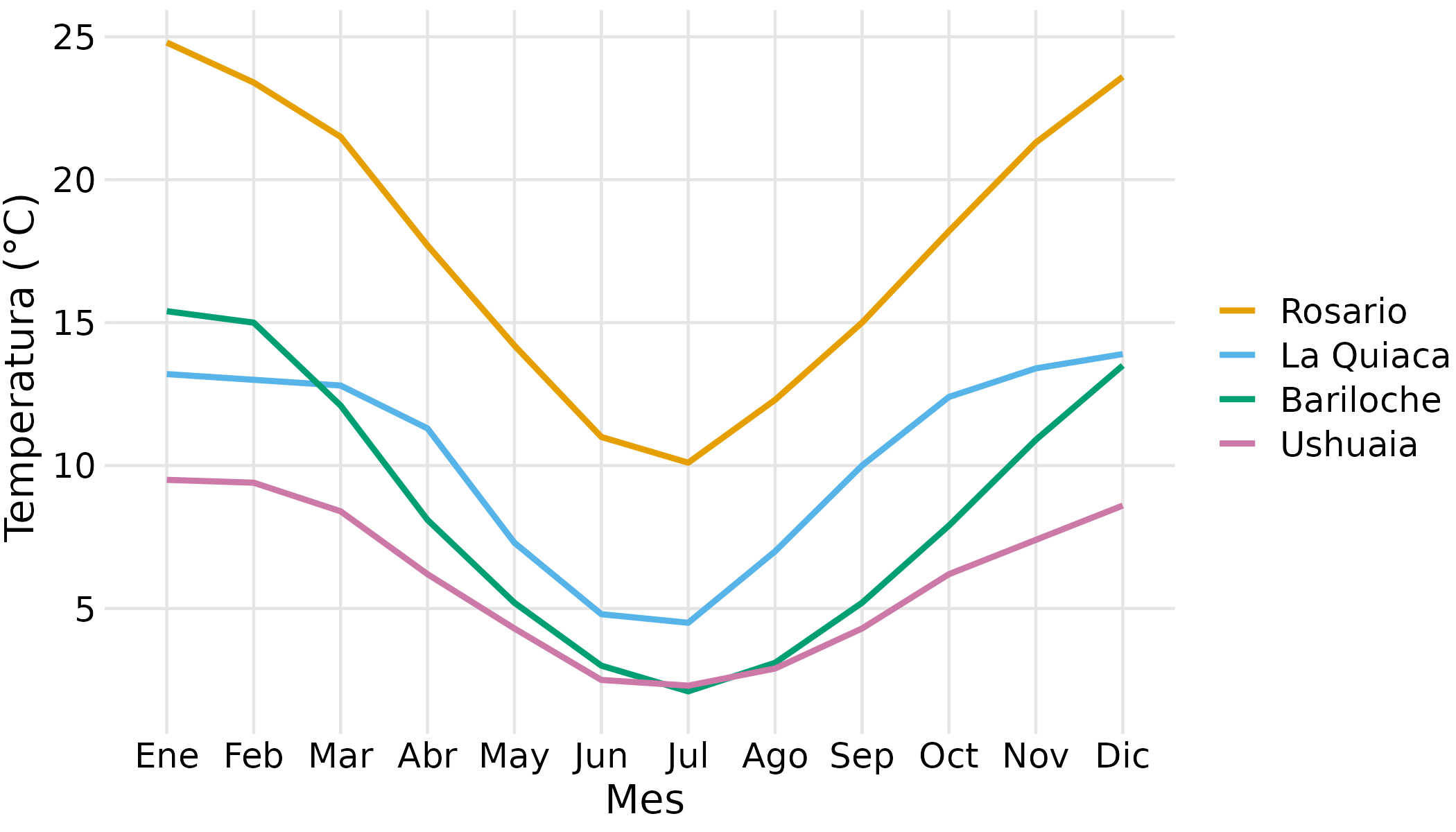- A continuación se presentan las primeras filas de un conjunto de datos que proporciona las temperaturas mensuales normales (temperatura promedio en cada mes durante una ventana de 30 años) para cuatro ciudades de Argentina. Esta tabla contiene 5 variables: mes, ciudad, provincia, código de la estación meteorológica que mide los datos, y temperatura (en grados centígrados).