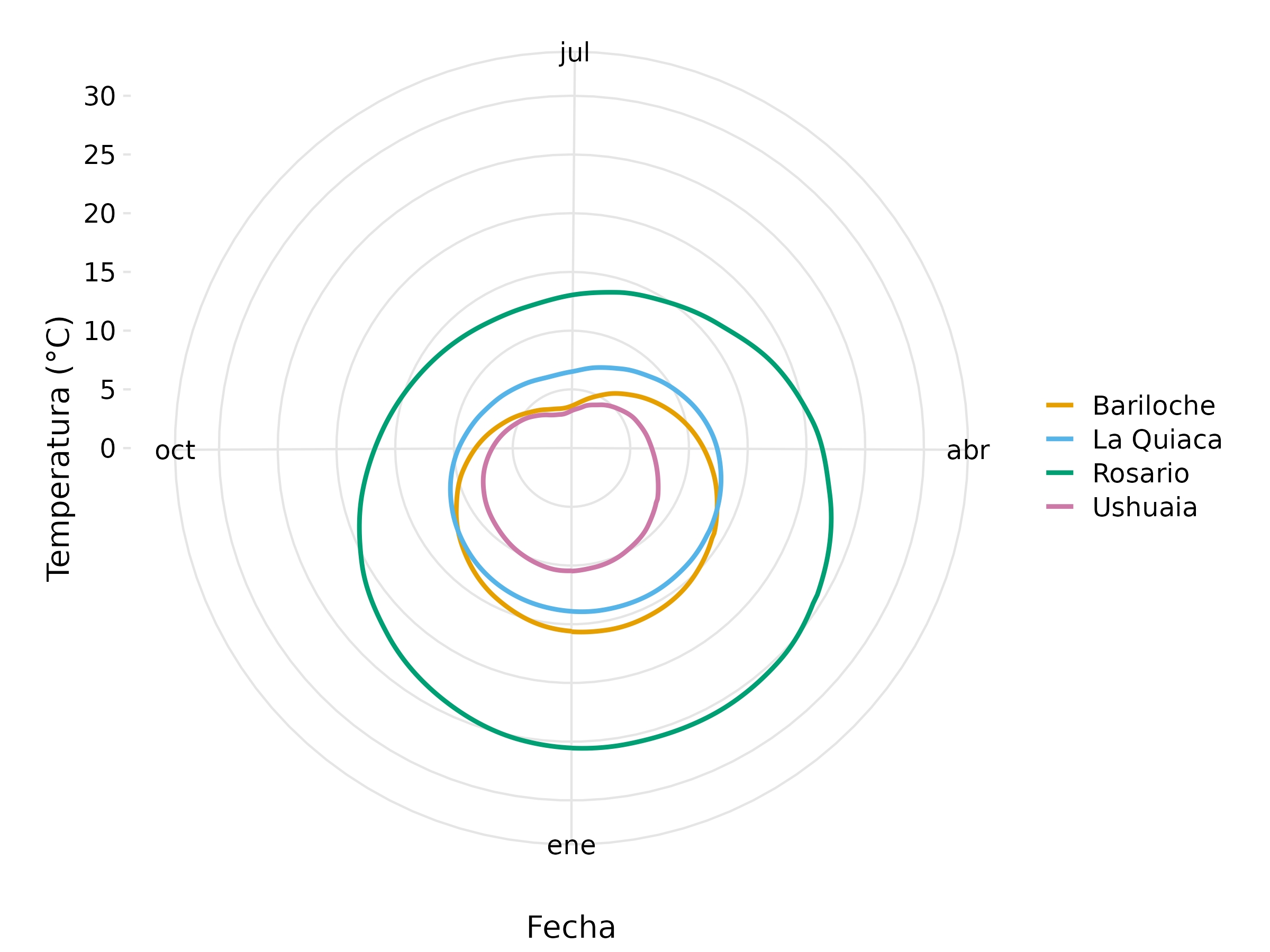 Al graficar las temperaturas normales diarias en un sistema de coordenadas polares, enfatizamos la propiedad cíclica que poseen. Además, esta versión polar destaca cuán similares o disímiles son las temperaturas en distintas ciudades a lo largo de ciertos períodos.