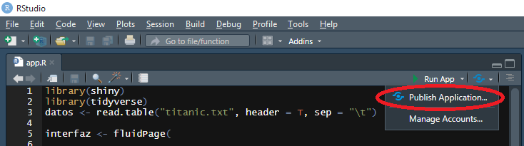 La conexión entre shinyapps.io y RStudio se da a través del botón Publish Application que figura en la barra de herramientas del editor: