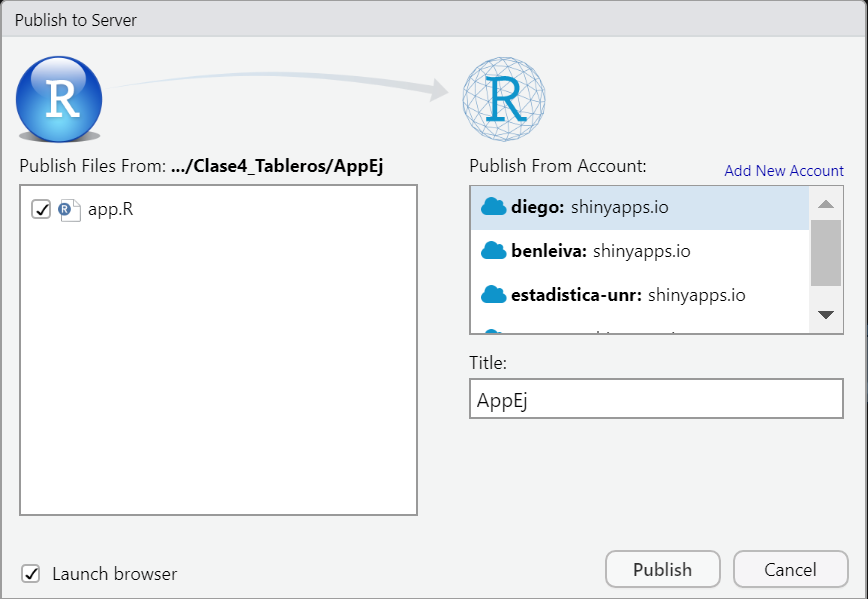 - Haciendo click allí accedemos a un menú donde podemos definir tres aspectos: archivos necesarios para la ejecución de la app (incluye código, imágenes, estilos CSS, etc.); cuenta asociada de shinyapps.io y nombre de la aplicación (texto que se mostrará a continuación de la barra en la URL):