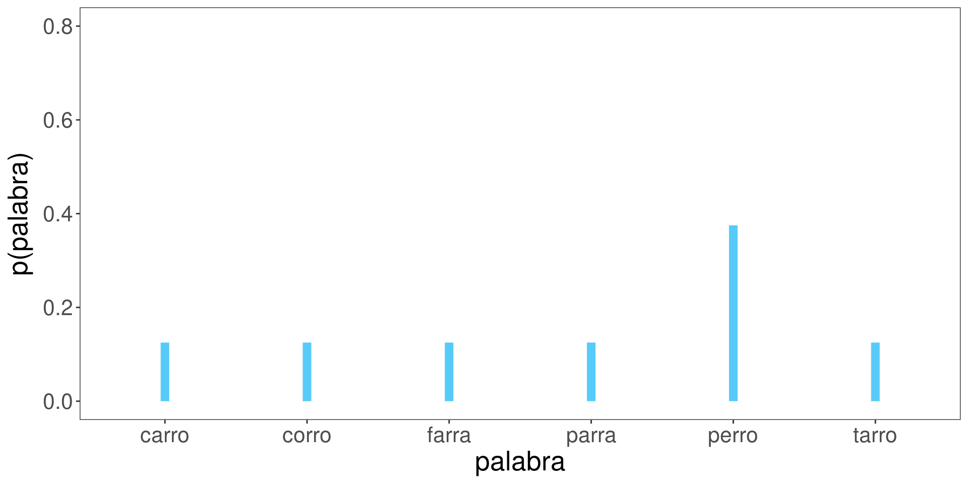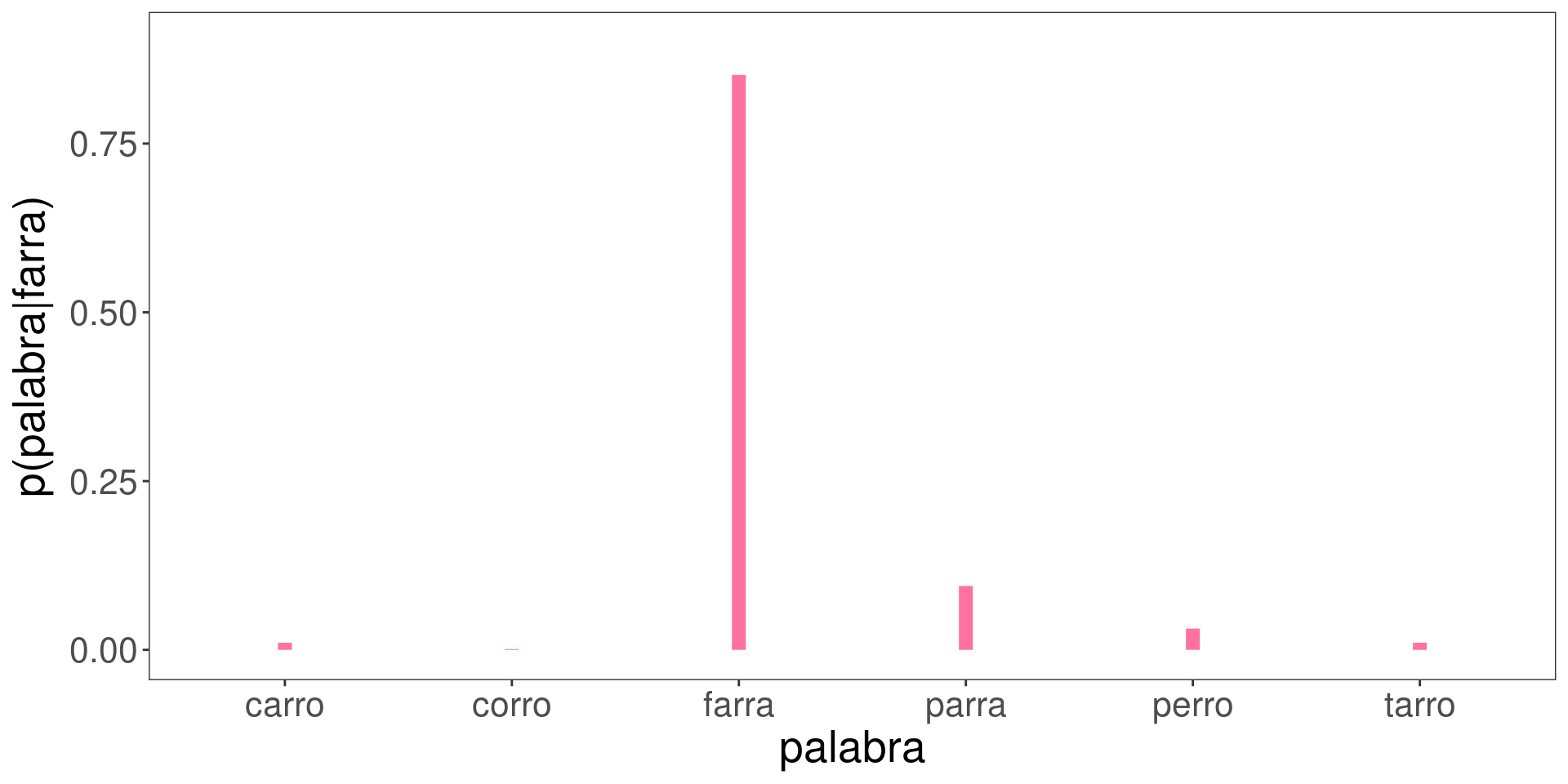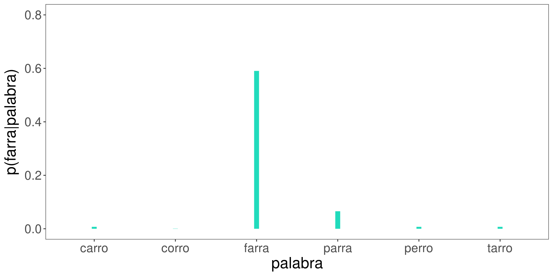 \[p(\mathrm{palabra}\mid \mathrm{farra}) = \frac{p(\mathrm{farra}\mid \mathrm{palabra})p(\mathrm{palabra})}{p(\mathrm{farra})}\]