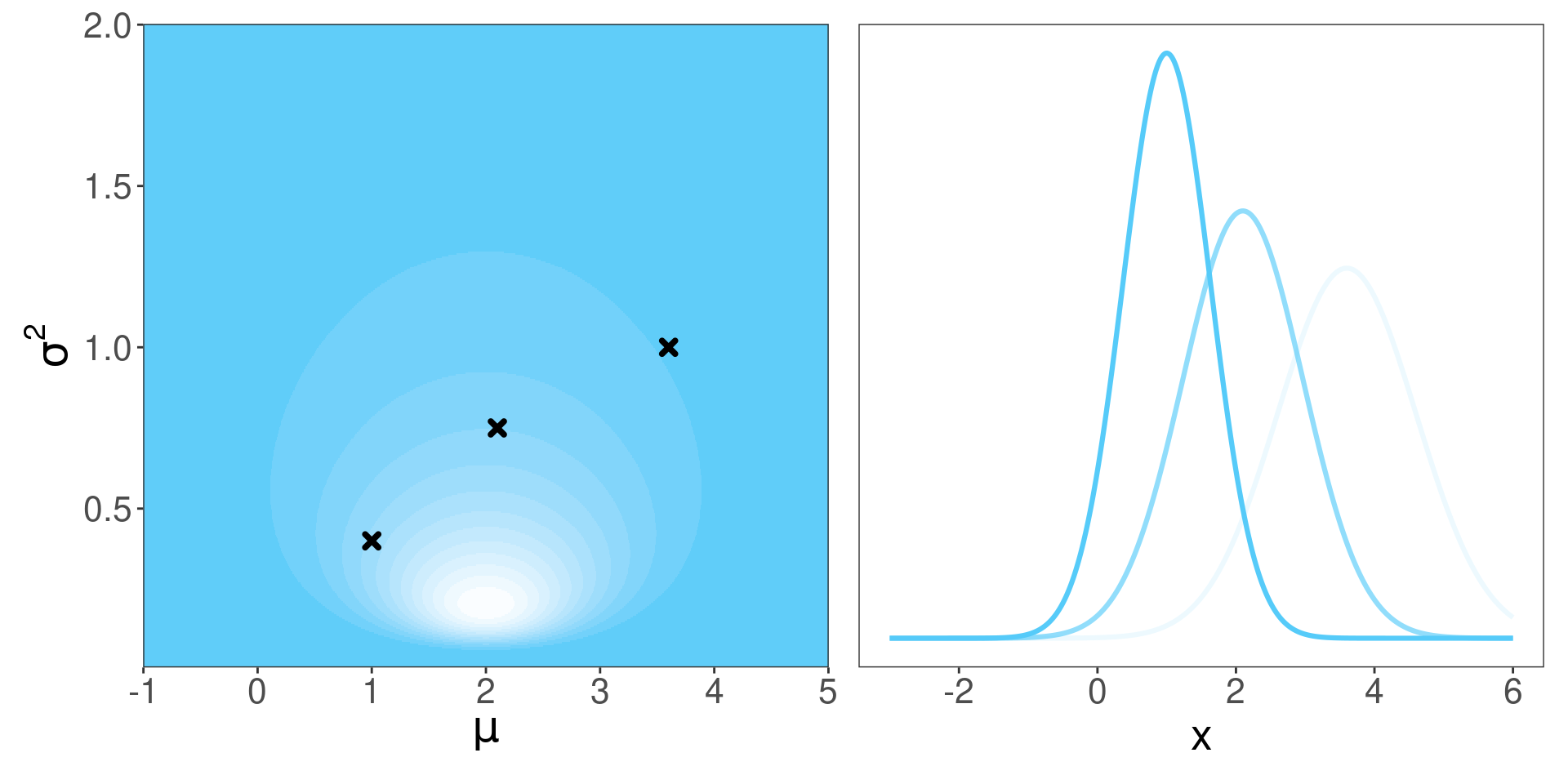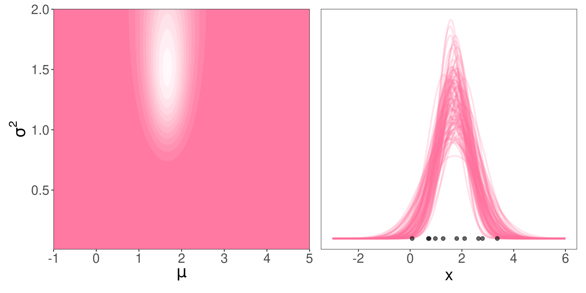 A posteriori (luego de observar los datos)… ¿qué ocurre con la plausibilidad de los valores de \(\mu\) y \(\sigma^2\)?