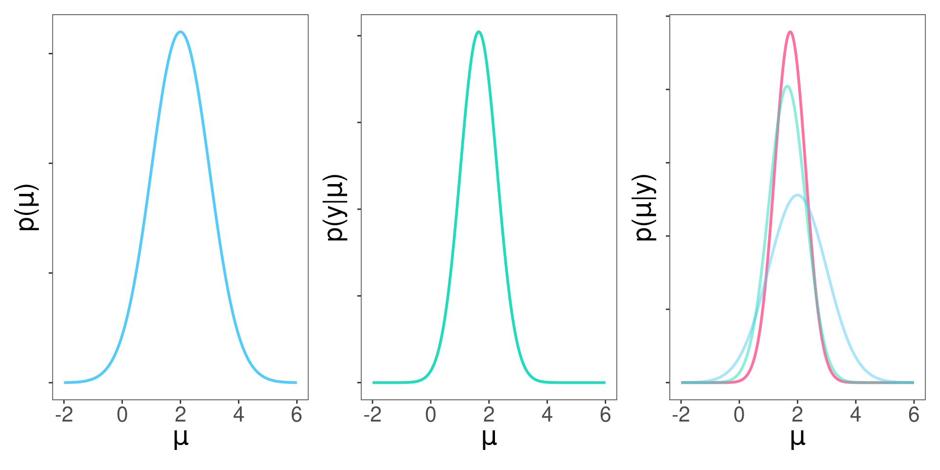 \[ \begin{aligned} Y_i \mid\mu & \sim \mathcal{N}(\mu,\sigma^2) \\ \mu & \sim \mathcal{N}(\theta,\tau^2) \\ \mu \mid \mathbf{y} & \sim \mathcal{N}(\theta_n,\tau_n^2) \end{aligned} \]