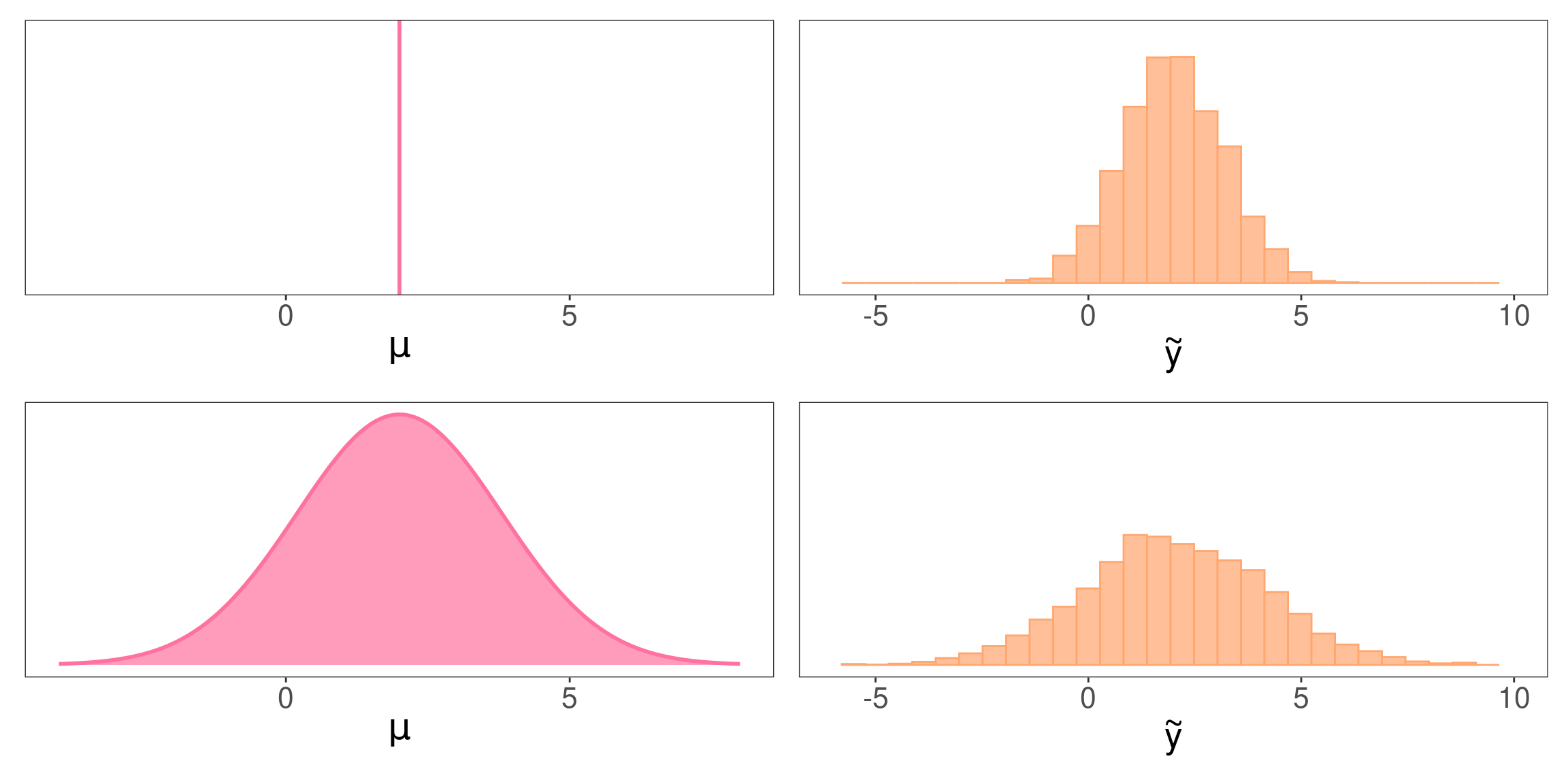 En otras palabras, si supiéramos que \(\mu = 2\), toda la variabilidad provendría de \(\sigma\), ¡pero no sabemos cuánto vale \(\mu\)! Puede ser \(2\) o \(1.98\) o \(1.43\)… Por lo que hay una componente adicional de varianza.