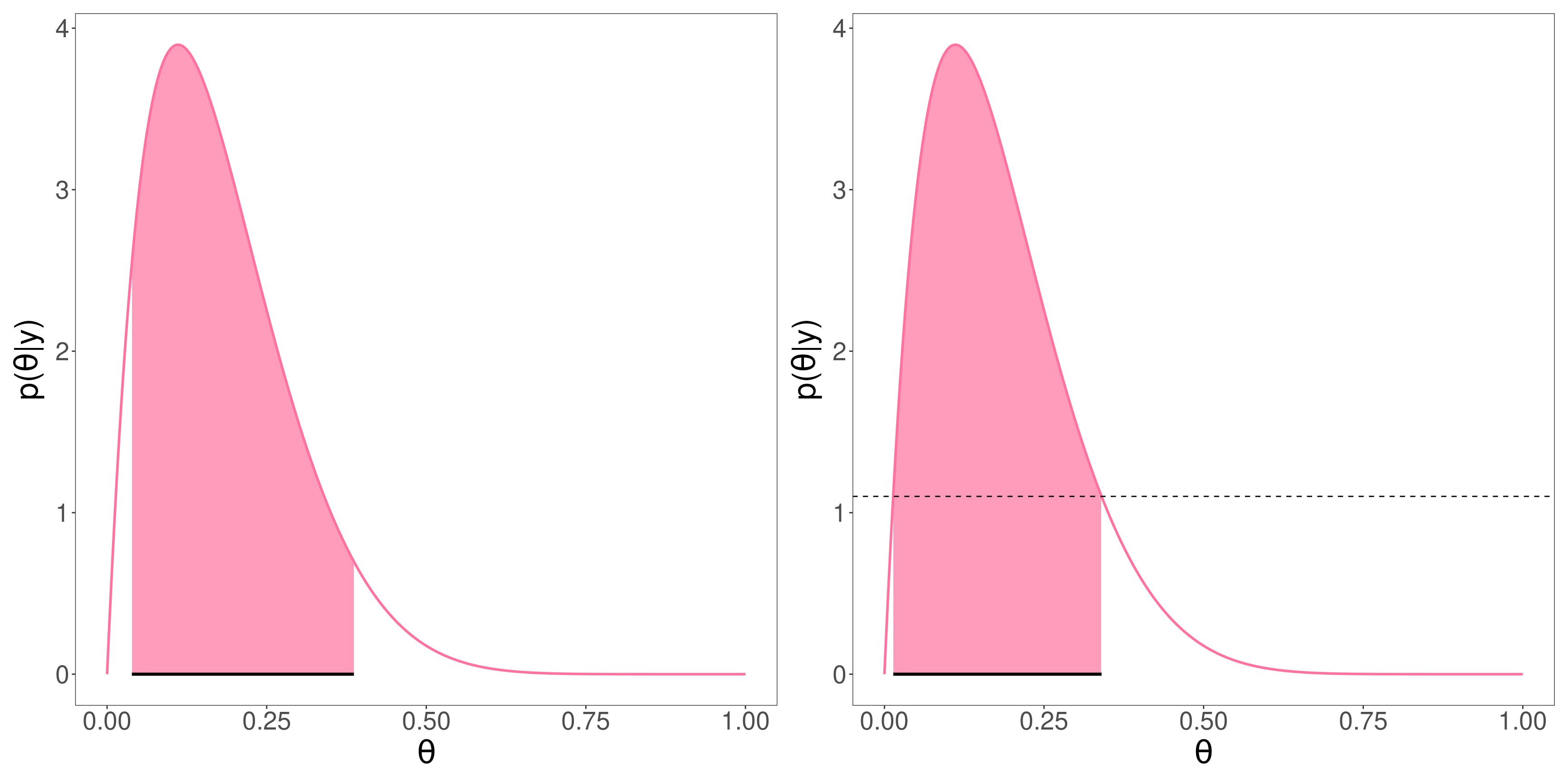 \[p(\theta \in C \mid y) = \int_C p(\theta\mid y) d\theta = 1-\alpha\] en el caso discreto es (\(\geq 1-\alpha\))