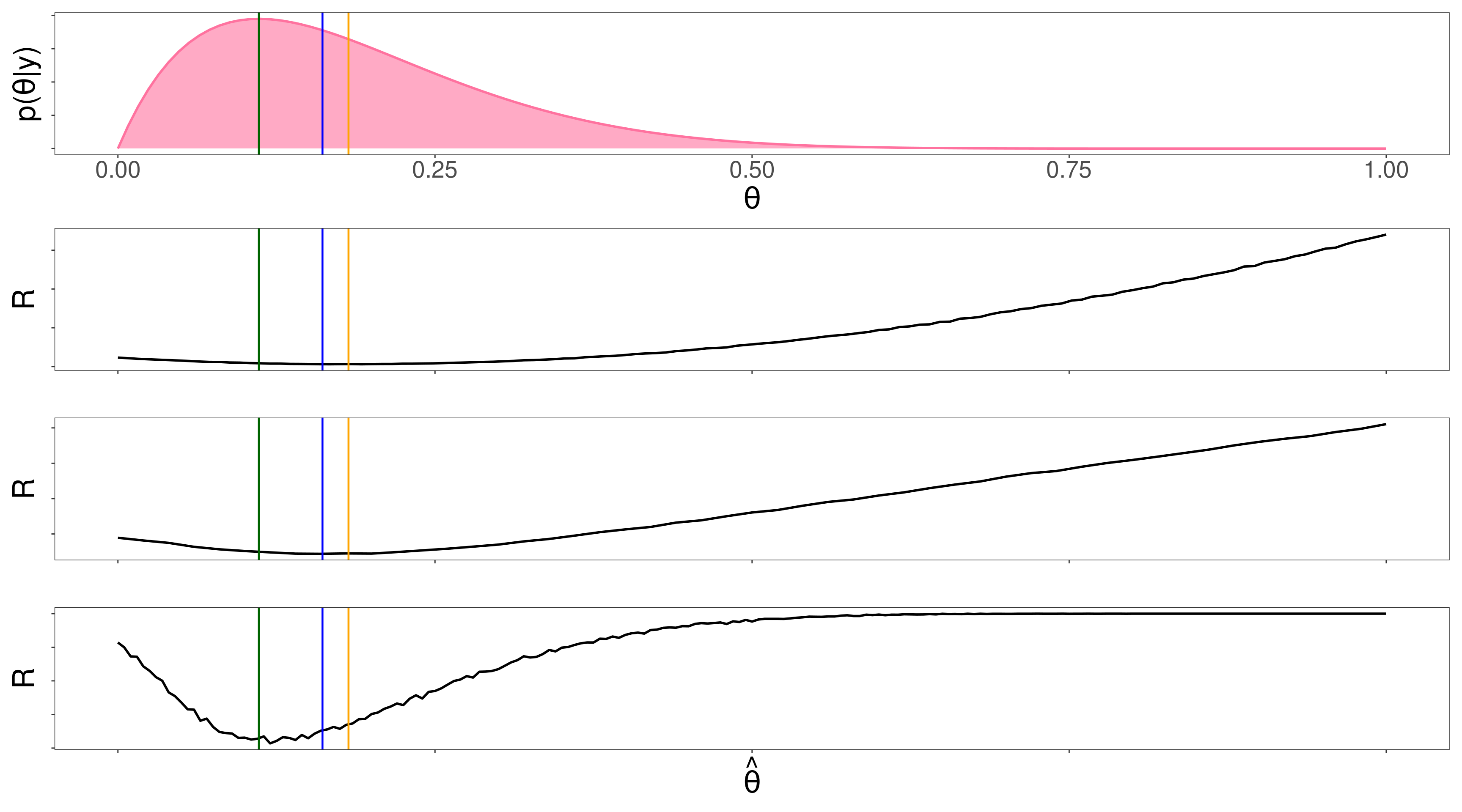 \(R\) es una función de \(\hat{\theta}\) (los distintos valores que podemos usar para resumir \(p(\theta\mid y)\))