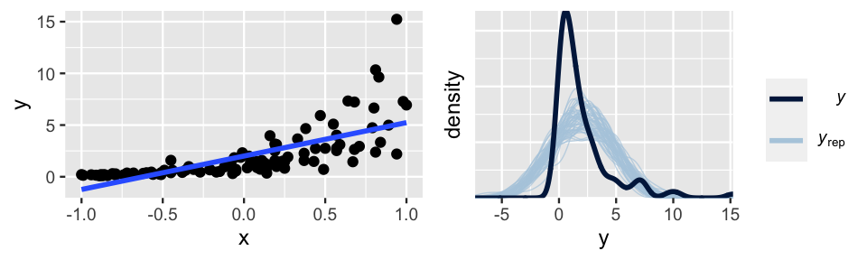 Por supuesto, las predicciones para \(y\) (\(\tilde{y}\)) también son probabilísticas: distribución predictiva a posteriori