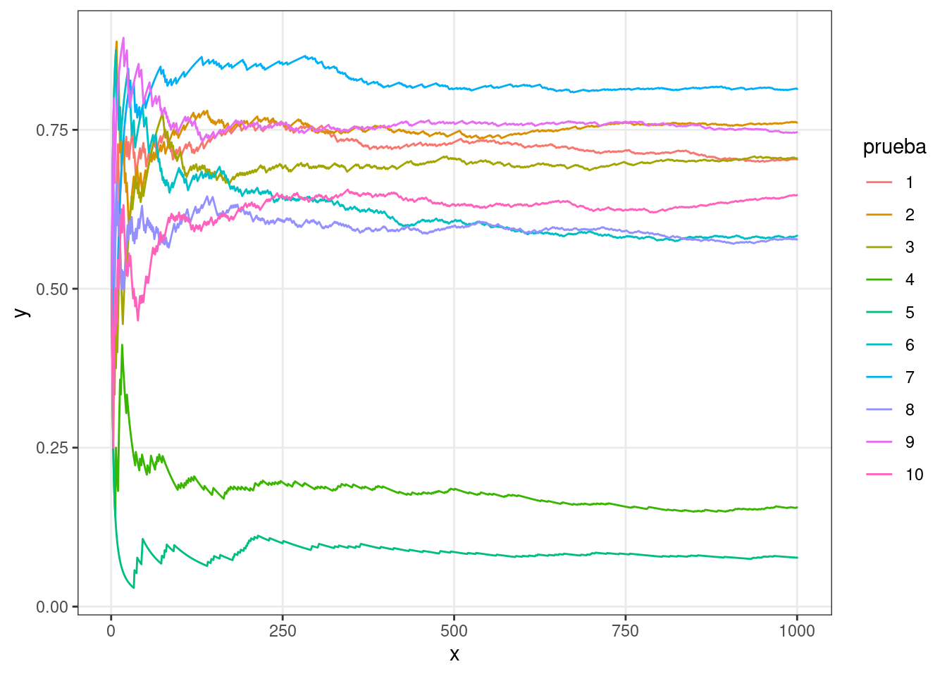 # Calcular la proporción de azules conforme se avanza en el experimento