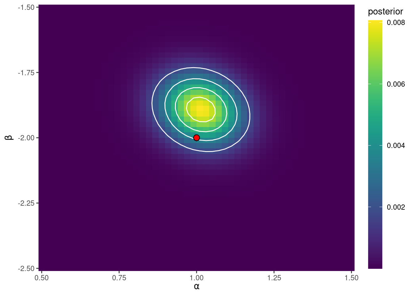 stat_contour(aes(z = posterior), col = "white", bins = 5) +