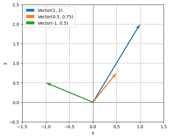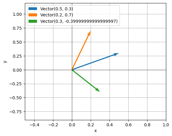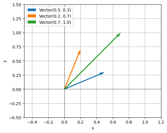 u = Vector(0.5, 0.3)v = Vector(0.2, 0.7)graficar_vectores([u, v, u + v])