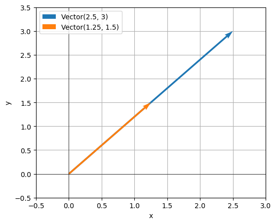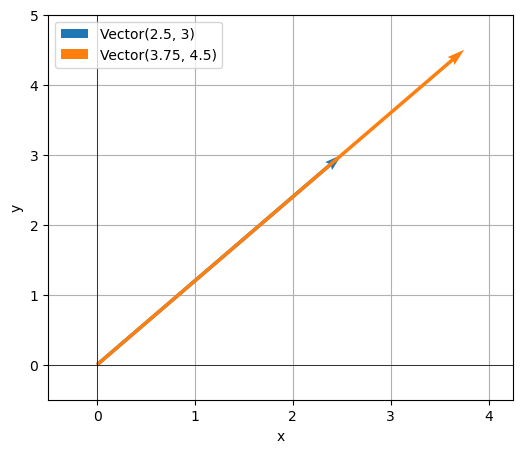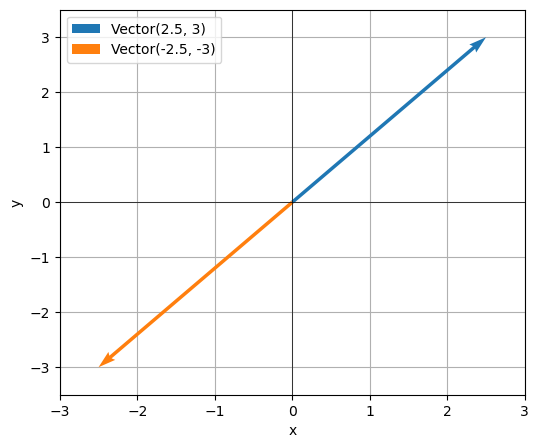 v = Vector(2.5, 3)graficar_vectores([v, v * (-1)])