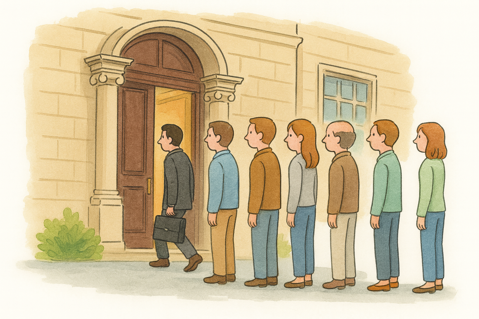 Para familiarizarnos con esta estructura, podemos imaginar una fila de personas esperando para entrar a un banco, como se muestra en la imagen: