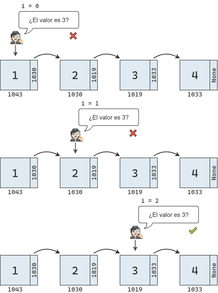En cada iteración, se compara el valor almacenado en el nodo actual con el valor buscado. Si el valor coincide, se devuelve el índice correspondiente y la búsqueda termina. Si no coincide, se avanza al siguiente nodo.