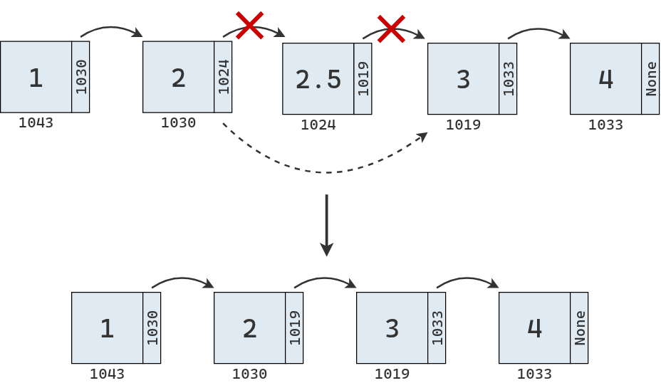 El siguiente diagrama muestra la eliminación de un nodo intermedio en la secuencia. Para realizarla se cambia el enlace del nodo anterior para que apunte al nodo siguiente. Opcionalmente, puede eliminarse también el enlace del nodo que fue removido.