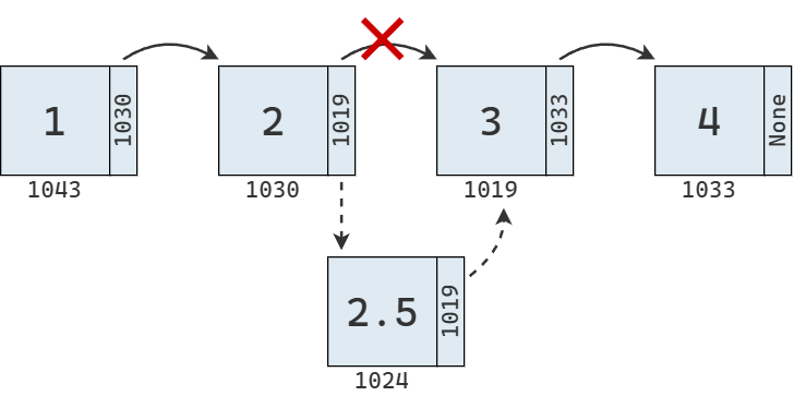 El siguiente diagrama muestra la inserción del valor 2.5 entre el 2 y el 3 en nuestra lista enlazada. Se crea un nuevo nodo que apunta a la ubicación del tercer elemento y se modifica el enlace del segundo elemento para que apunte al nuevo nodo.