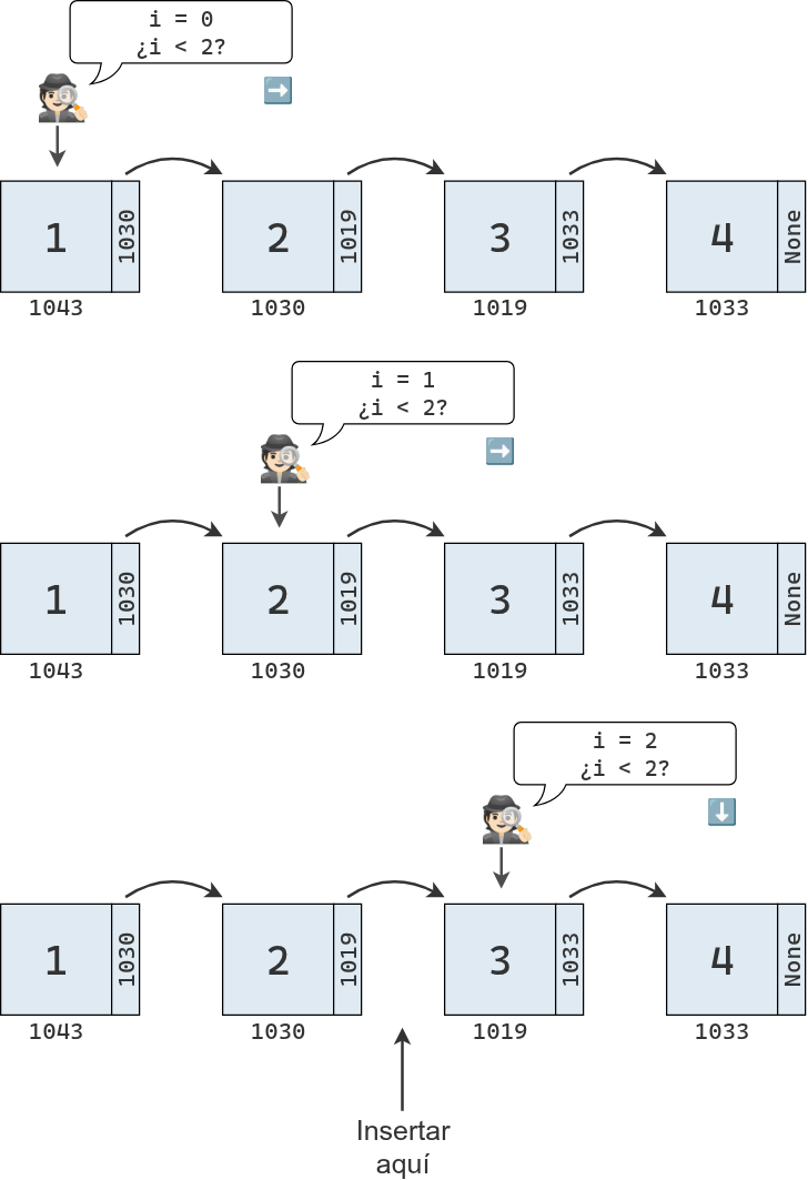 Sin embargo, antes de poder realizar este cambio de enlaces, es necesario encontrar los nodos involucrados, lo que requiere recorrer la lista desde el inicio. Si queremos insertar el valor 2.5 en el índice 2, es necesario realizar la búsqueda que describe el diagrama debajo.
