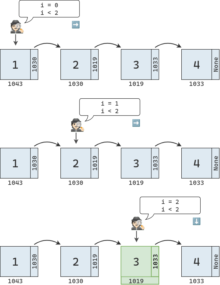 En cada paso, se avanza nodo a nodo, accediendo al siguiente e incrementando el valor del índice.